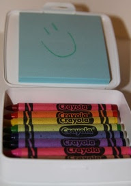 Tip 5. I remember the days of going out with my little ones and trying to keep them occupied while mom attended to business. My purse was full of toys and sippy cups and snacks and who knows what else. They loved to color, and I think this will help all the mamas out there with young artist. Just get some crayons and a sticky tab and put them in a used up wipey box. Only give them this when you're out, so it's their special treat during those times. Good idea!